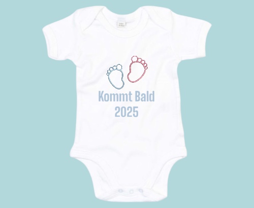 Der Body wird mit dem liebevoll bestickten Motiv "Kommt bald" personalisiert und kann zusätzlich mit dem Namen des Babys sowie dem Geburtsjahr versehen werden – ein wundervolles Geschenk zur Geburt oder Babyparty.